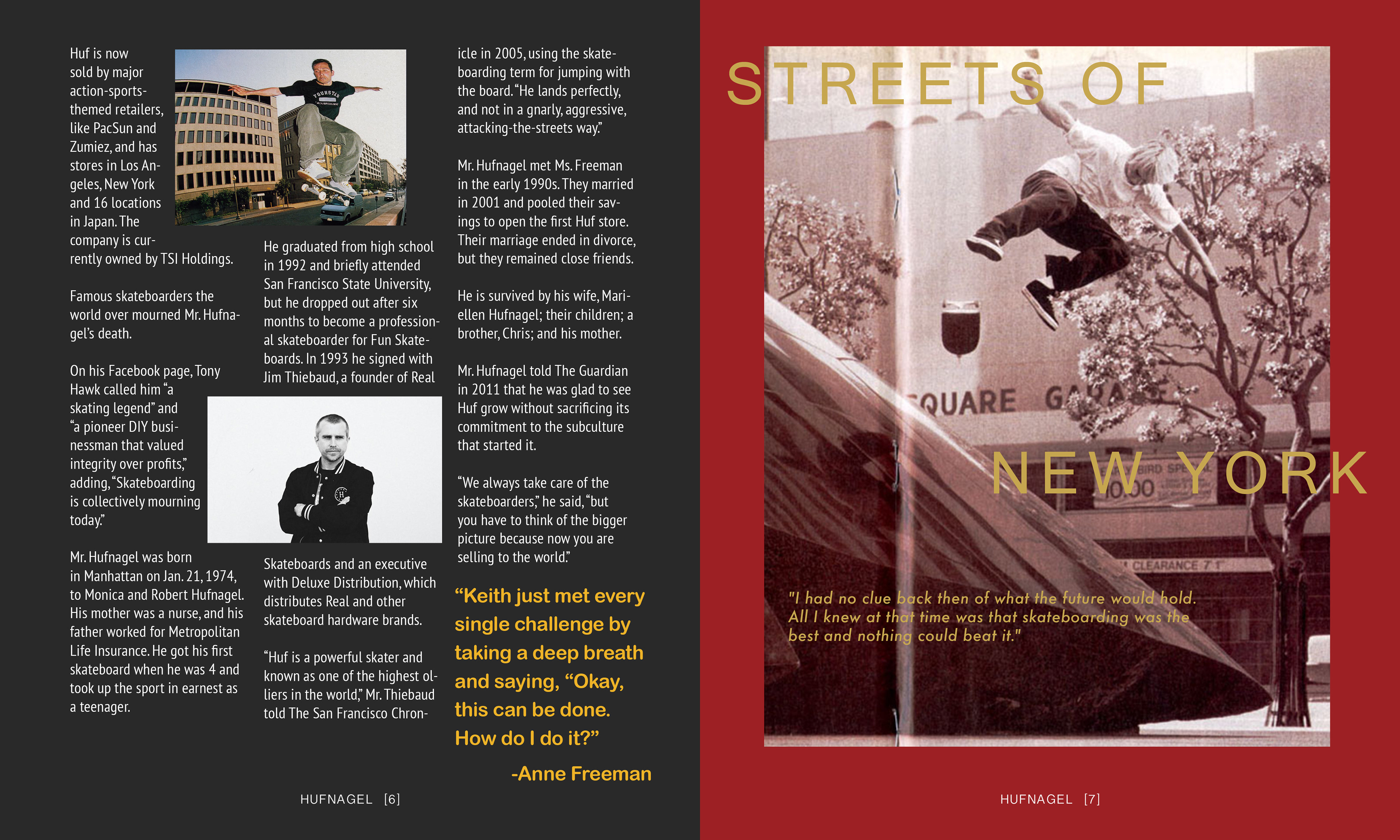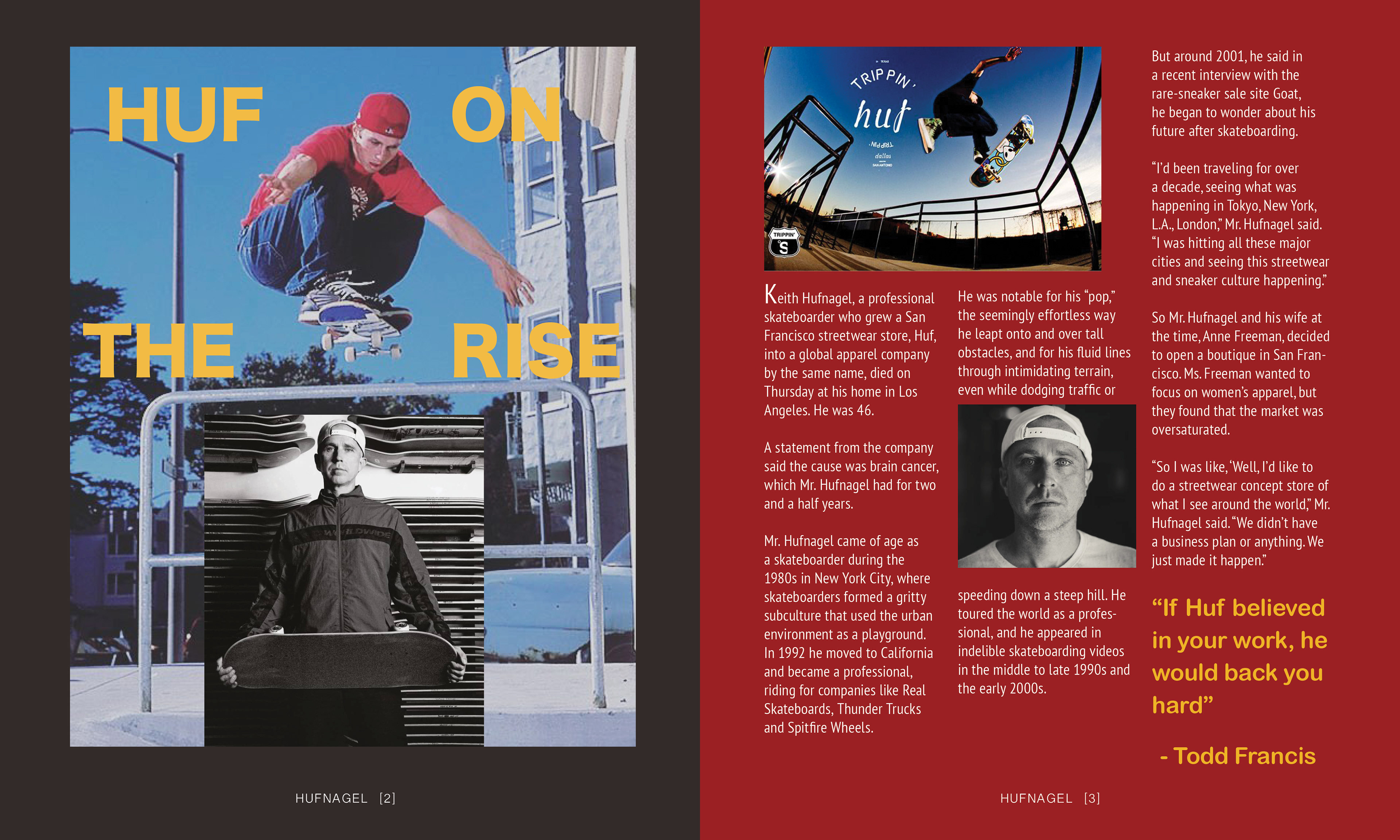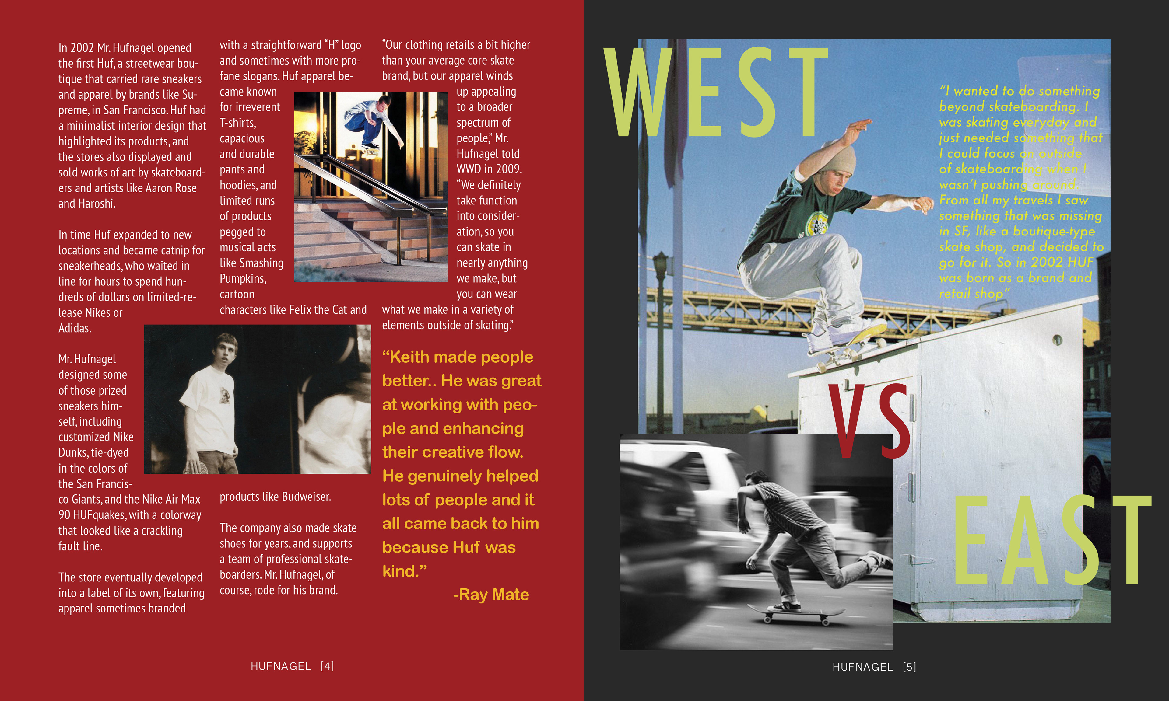This was my original idea for a skateboard magazine called "ENGAGE". This hypothetical edition would be a tribute to Keith Hufnagel, founder of one of the most prominent streetwear and skate brands on the market, "HUF". The "HUF" brand was known to be worn specifically by skaters in its early years, but eventually transitioned to all different types of people. It doesn't matter if you skate or not, HUF is a state of mind and a culture of its own, which is what initially inspired me to make the magazine concept. A useful reference for my inspiration was "THRASHER MAGAZINE," a very popular magazine in the world of skateboarding. I studied the way they use headlines, titles, photos, pill-quotes, etc. This helped me implement the skateboarder flair that people generally love so much within the magazine.