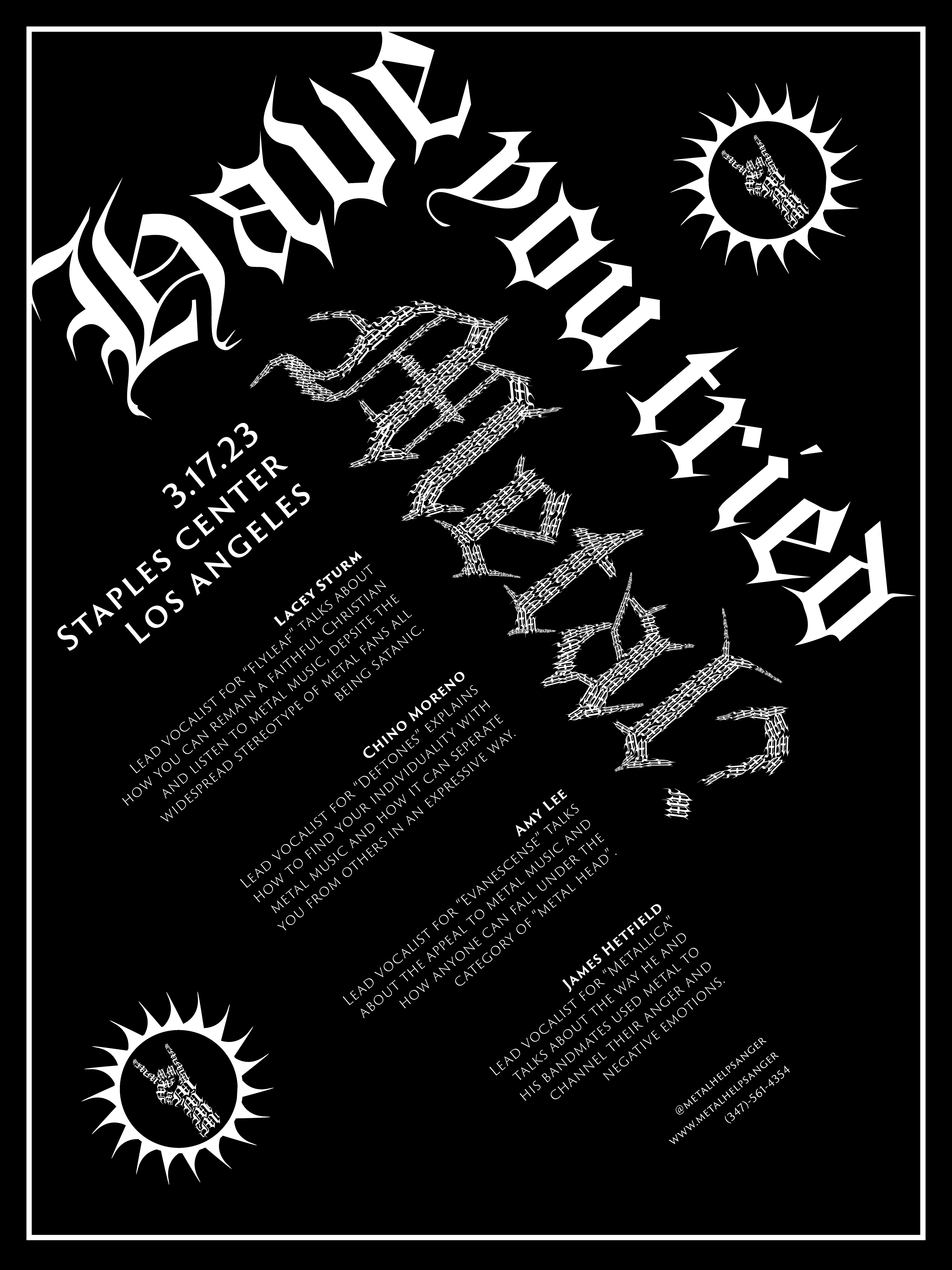 This poster came from an assignment focused on making a poster for a fictional seminar regarding any topic. The research process came from being given a single word and then creating ideas using the method of mind mapping. I began with the word "shiny." I mind mapped a couple of times and came to an idea based on guitars, because guitars happen to be shiny. The process continued by building a new mind map, from the new idea of "guitars." I linked the word "guitars" to "heavy metal", because the two relate to each other directly. Finally, I chose to pursue a heavy metal poster. This poster is based on concepts of the genre, not the actual music itself; stigmas or ideologies surrounding people who play heavy metal or fans of the genre.