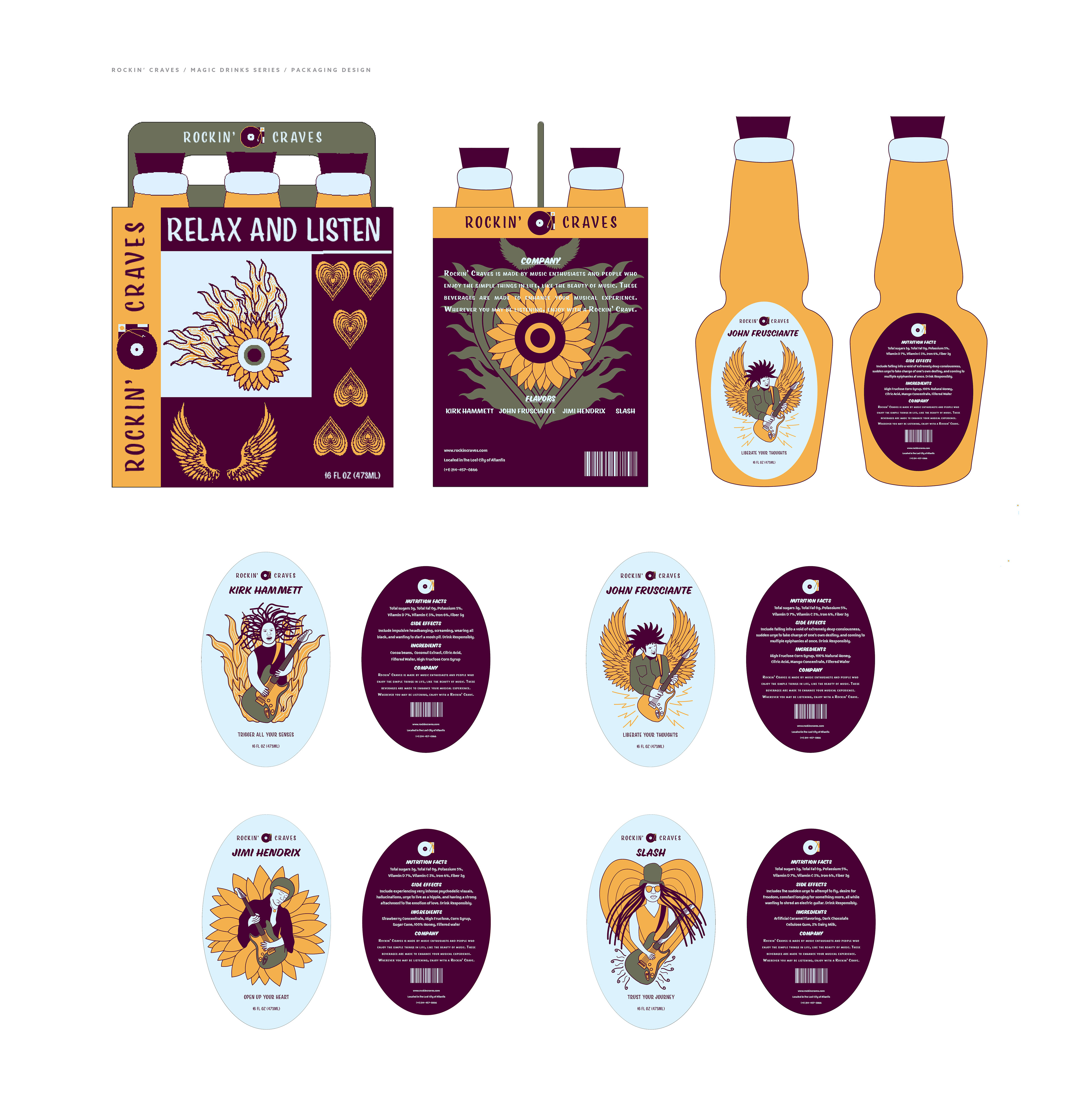 This concept came from a project based on brand marketing. The objective was to make a beverage and build a brand name and logo based on it. Once we had an idea for the beverage, the brand production had to be built. Logos, original packaging, even the description of nutrition facts, was all created to sell the ROCKIN' CRAVES brand name as legit as possible. I enjoyed this project because it made me understand the mechanics of having to make a good brand name, along with accessorizing the brand and hypothetical mockups of the brand. I wanted an appealing beverage that also served a pleasing scene to the ideal consumer of my product, as well.