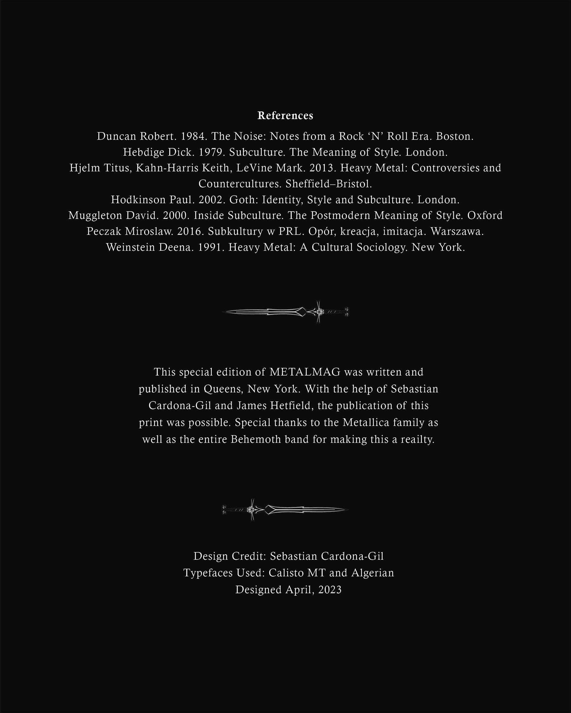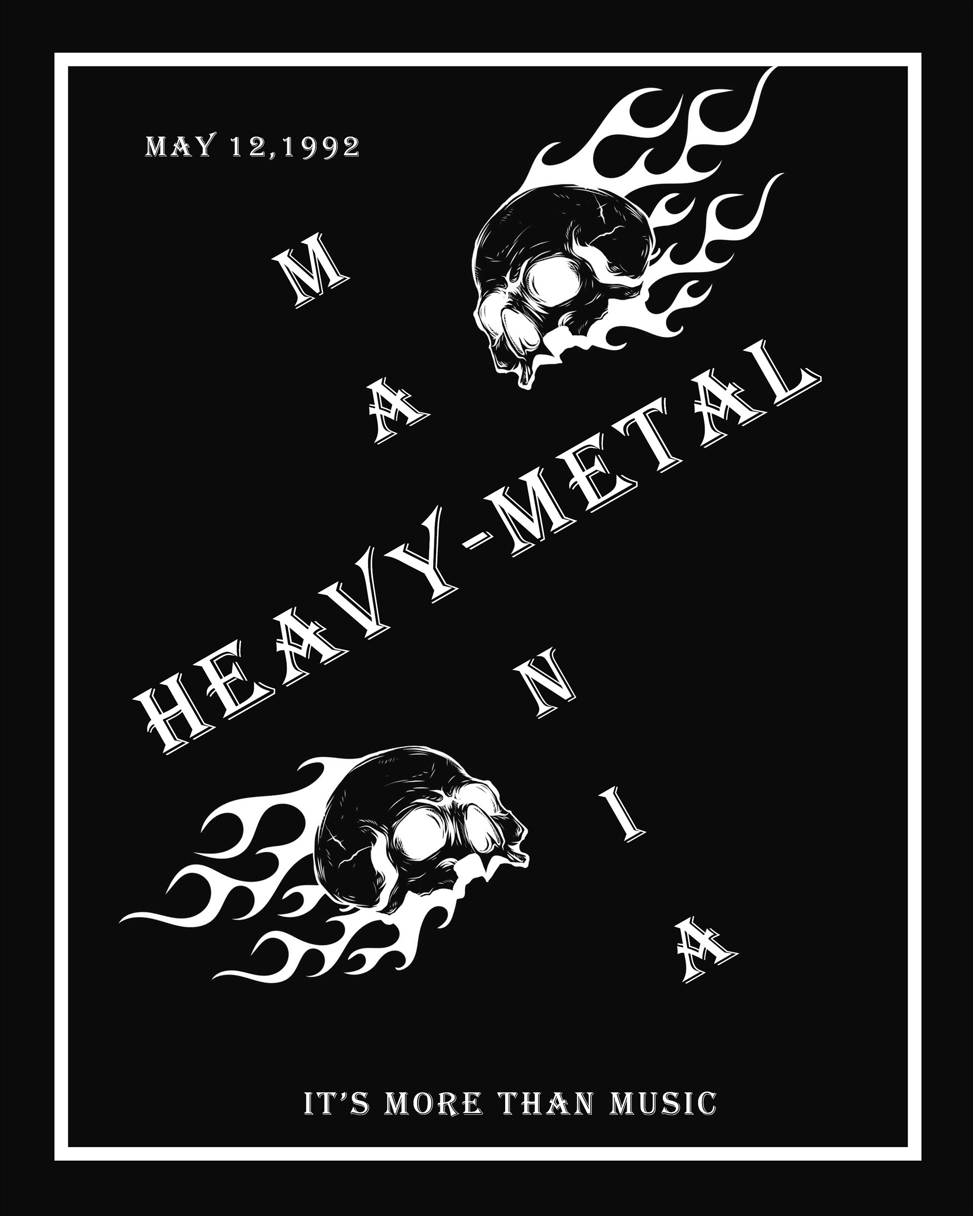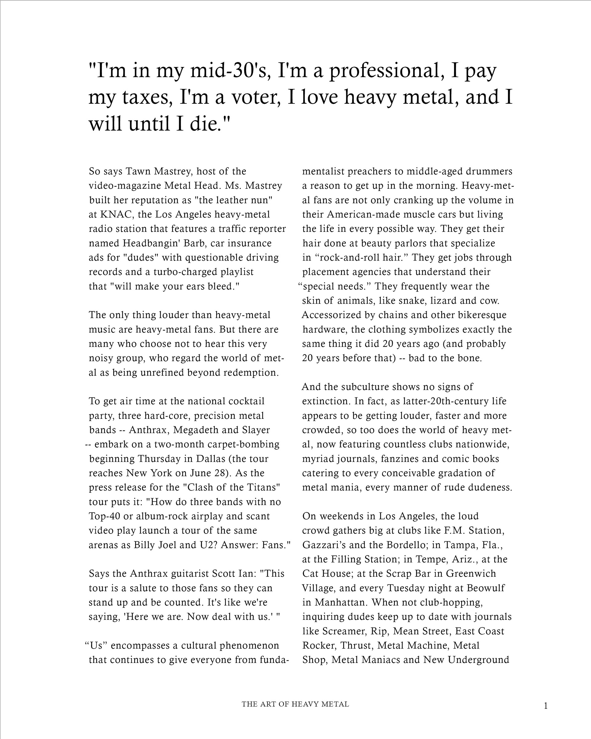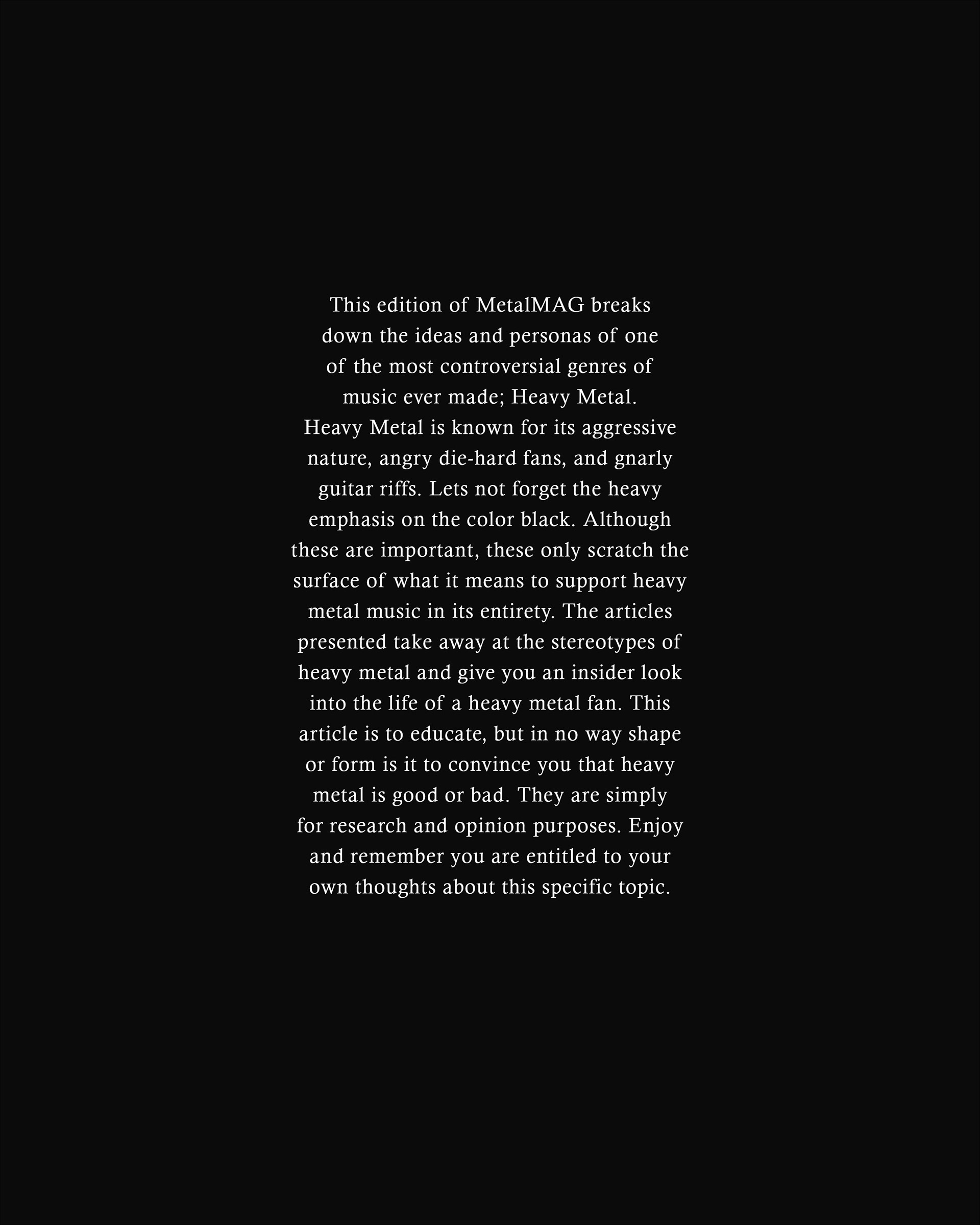 "The Art of Heavy Metal" is a 20-page spread concept for a fictitious heavy metal magazine, named "METALMAG". This edition of the magazine was focused on breaking down the stigmas and ideas revolved around the genre of music, the people who support this specific genre, and anything in between. Both articles used within the magazine were written at different points in time, which make for an interesting comparison on how viewpoints have evolved in the last 30 years, alone.